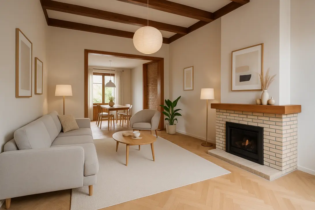 * Woonkamer met hoge plafonds, een grote raampartij aan de straatzijde en een gaskachel.