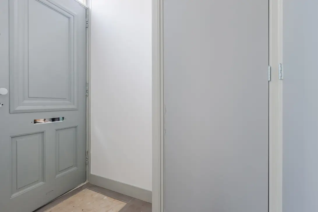 The entrance hall with meter cupboard leads to a spacious living room with high ceilings and modern concrete-look walls. The staircase to the upper floor and a large storage closet are also located here. The open kitchen has a fresh look and includes various appliances. In the rear extension, there’s space for a dining area or home office, with sliding doors opening to the cozy, sunny garden with back entrance – perfect for a summer barbecue or your morning coffee in the sun.
