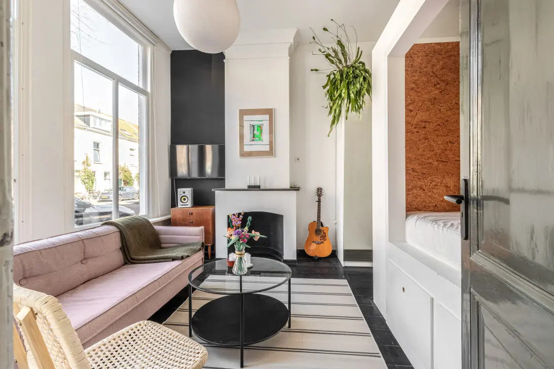 What a beauty! As soon as you enter, you notice the characteristic atmosphere of this house. The charm of living in a home from the early 20th century is emphasised by a stained-glass window above the front door, a sturdy wooden floor, the high ceilings and panel doors. Once inside, the creative layout impresses. The modern bed box is not only a cool eye-catcher; it is also a clever way to create more living space in this townhouse - practical and cosy at the same time.
