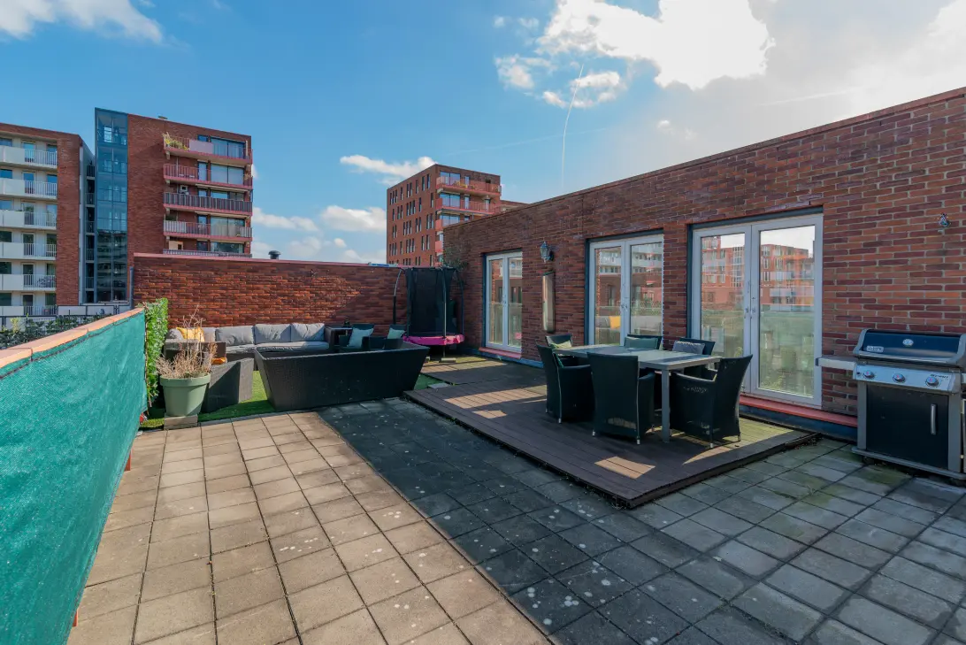 Het dakterras is het absolute paradepaardje: zonovergoten, ruim en perfect voor diners, loungen of spelen. Met ruim 76 m² voelt dit als een extra woonlaag in de open lucht.