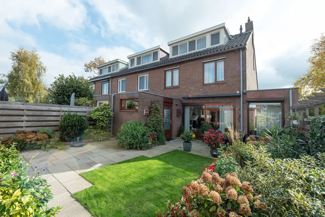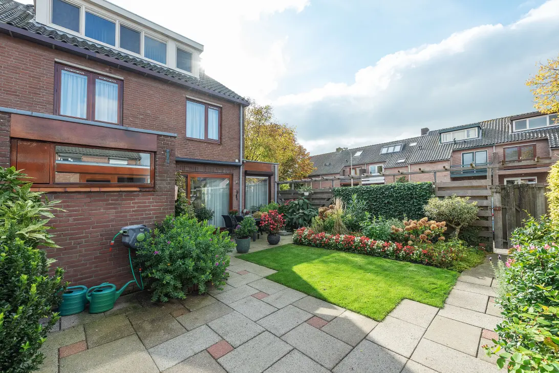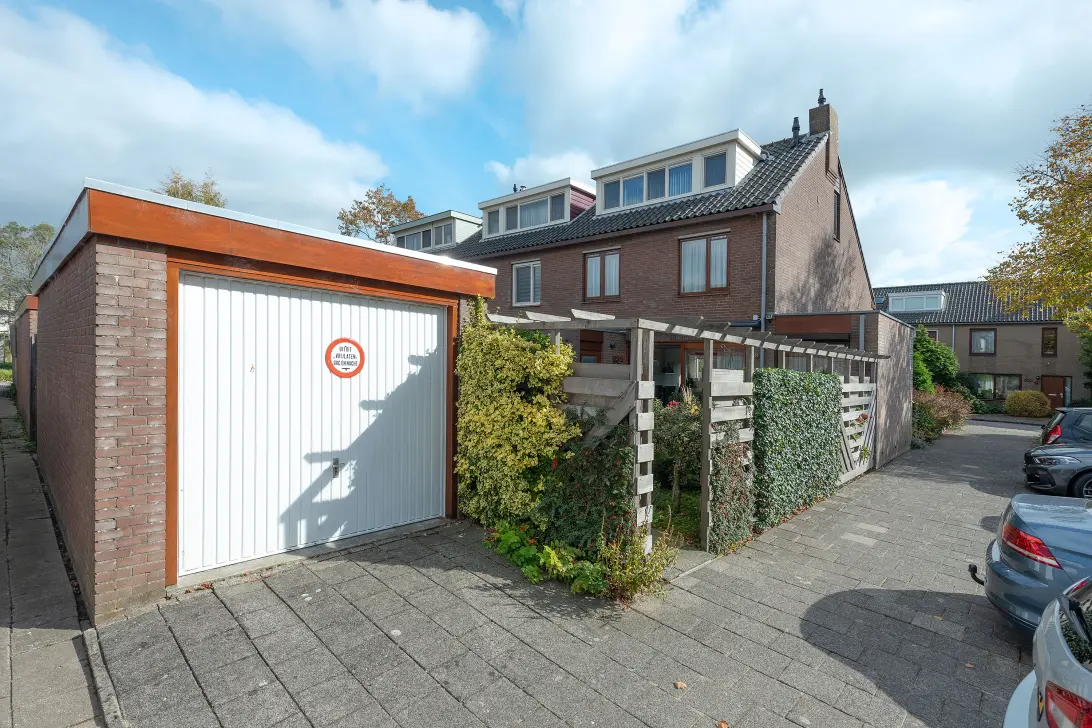 De achtertuin is toegankelijk via de grote schuifpui, de bijkeuken en via de achterom. De tuin is verzorgd, grotendeels betegeld, met veel beplanting en een grasveldje. Door de noordwestelijke ligging schijnt de zon in de middag en de avond heerlijk de tuin in en er is een elektrisch zonnescherm aan de achter- en zijgevel geïnstalleerd. Aan de achterzijde van het perceel is de garage, ideaal voor het stallen van fietsen/motoren en opbergen van de tuinspullen. Er is voldoende parkeergelegenheid; op eigen terrein in de voortuin, voor de inrit van de garage en de openbare parkeerplekken in de straat.