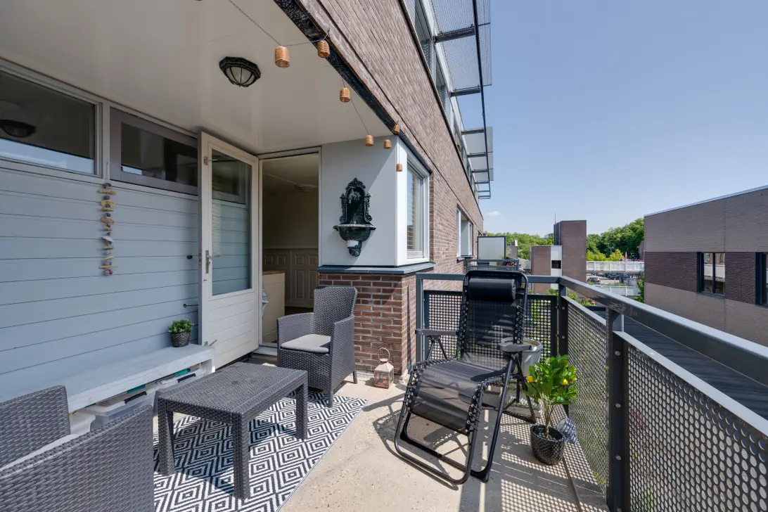 Entree met meterkast, gevolgd door de gang welke alle vertrekken met elkaar verbindt. Zodra je de woonkamer binnen komt valt meteen het mooie uitzicht op en word je automatisch naar het balkon getrokken. Door de hoekligging is er door de zijramen extra veel lichtinval. De woonkamer loopt vloeiend over in de eigentijdse keuken. Deze keuken met lichte fronten en donker werkblad bevat een vaatwasser, inductiekookplaat, afzuigkap, combi-magnetron, oven en Amerikaanse koelkast. Het appartement telt een tweetal ruim bemeten slaapkamers. De geweldige badkamer is voorzien van een inloop- regendouche en wastafelmeubel. Het toilet met fontein is separaat en bereikbaar vanuit de gang. Ook is er een aparte ruimte voor de wasmachine en droger.