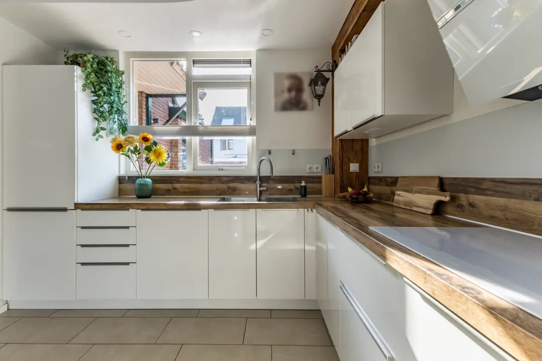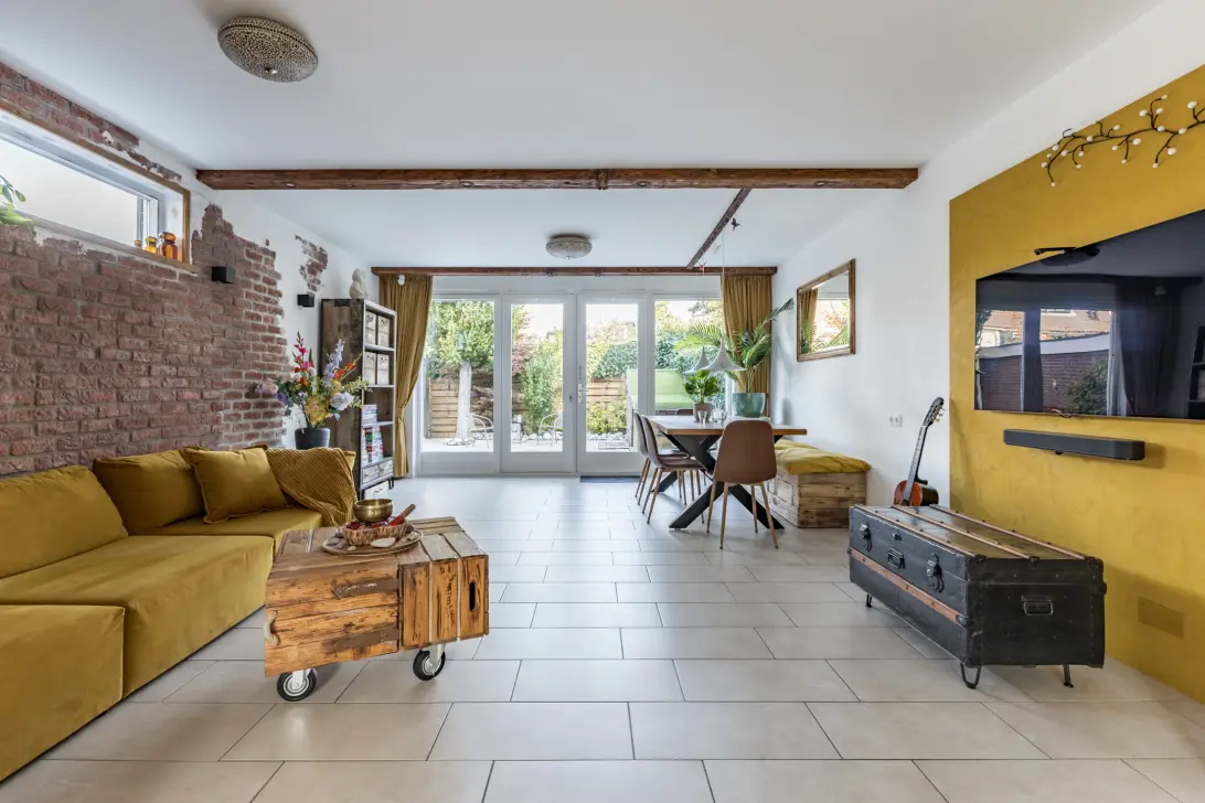 The house is well-maintained and has a pleasant layout with plenty of light and space. The living room offers ample space for a generous sitting and dining area, while the open connection to the garden creates a pleasant atmosphere. The kitchen is large, fully equipped, and practically laid out. From the living room, large French doors open directly onto the spacious and sunny garden, which is accessible from both the front (via the alley) and the rear. An attached storage shed is located at the front of the house.