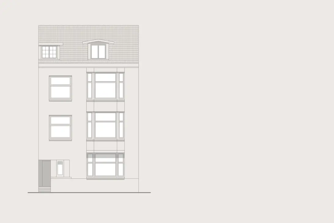 We beginnen aan de Geleenstraat, onder de bomen, voor een gevel met ritme en rust. De stenen trap leidt naar een klassieke portiek, waar de donkere houten voordeur tussen granieten stijlen al iets belooft van de robuustheid binnen. Eenmaal over de drempel betreed je een diepe hal die de woning organiseert: linksaf naar de woonvertrekken, rechtdoor naar de tuin. De woonkamer aan de voorzijde ontvangt je met licht en glas-in-lood het zuiderlicht komt helder binnen en kleurt de ruimte subtiel. De visgraatvloer, de hoge plafonds, de stille klasse van de afwerking: dit is een ruimte die ademt. Via schuifdeuren met glas-in-lood wandel je door naar de eetkamer, en daar ontvouwt zich de lengte van het huis. De tuin lonkt al. De keuken ligt in de hoek, open maar niet nadrukkelijk aanwezig. Wit, hout, overzicht. Vanuit het aanrecht zie je het groen buiten. Hier kook je met zicht en lucht. Je stapt zo de tuin in: een royale patio met bomen, zitplekken, ruimte. Aan drie zijden openen ramen en deuren zich naar dit middelpunt van het huis. Binnen en buiten vloeien. Aan de achterzijde liggen de slaapkamers. De hoofdkamer grenst direct aan de tuin, met wit houtwerk en zachte tonen. In de uitbouw (voormalig berging) zijn twee extra kamers, licht en rustig, waarvan één met eigen wastafel en de ander als werkplek. Tussen deze ruimtes in ligt de badkamer: onder een schuine lijn, met ligbad, frisse tegels en een knipoog naar het kleuraccent in het glas-in-lood. Het geheel voelt logisch, helder en gelaagd. Een woning die zich niet opdringt, maar zich langzaam openvouwt en waar de rust van de tuin de toon zet.