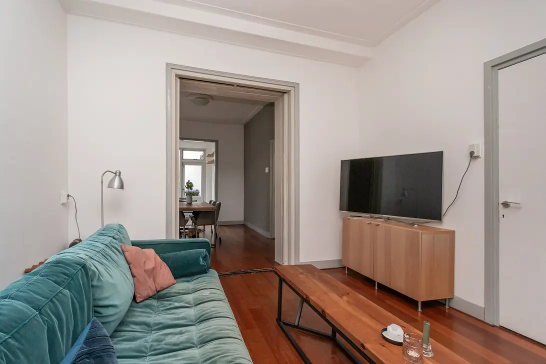 Overloop, zeer ruime woonkamer/slaapkamer over de volle lengte van de woning met openslaande deuren naar het balkon. Dichte keuken voorzien van diverse inbouwapparatuur en een badkamer voorzien van douche en een toilet.