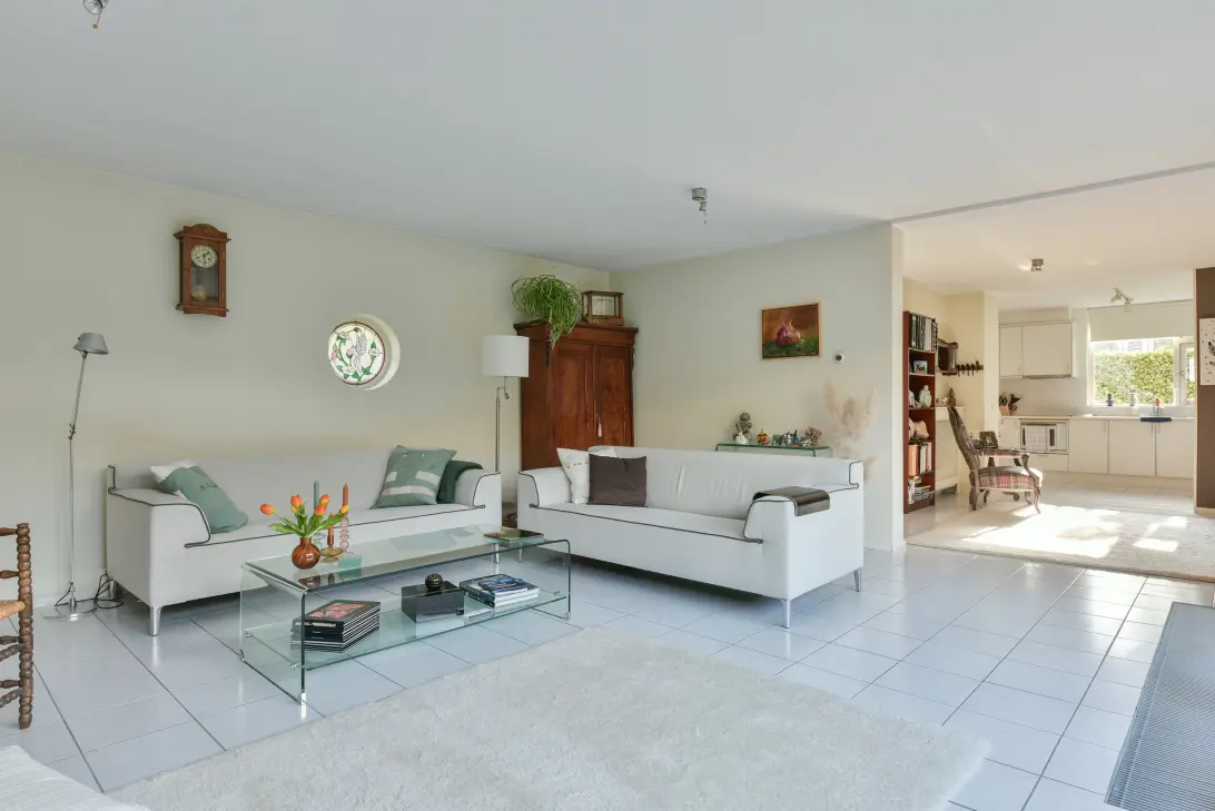 Heerlijke grote woonkamer met brede schuifpui naar de zonnige en beschutte tuin.