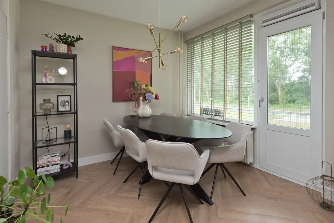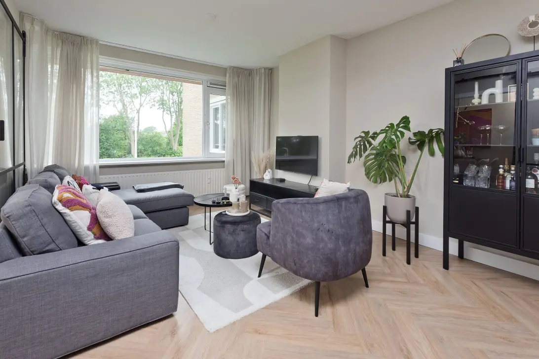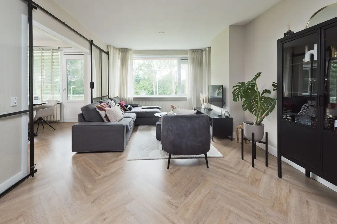 De woonkamer bestaat uit twee delen welke door middel van een 'custom made' stalen glazen schuifdeur afgesloten kunnen worden van elkaar. Ideaal voor het creëren van een rustige thuiswerkplek. De woonkamer is ruim opgezet en kan door een nieuwe eigenaar op verschillende manieren worden ingericht. Het tweede balkon is hiervandaan bereikbaar. Vanaf de middag schijnt hier heerlijk de zon. Het grote raam bij de zithoek beschikt over een handbediend zonnescherm.