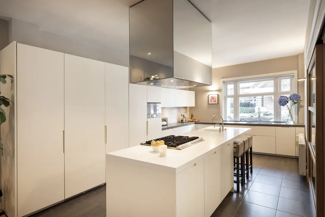 De keuken met groot kookeiland is uitgerust met hoogwaardige inbouwapparatuur van Gaggenau en biedt alle mogelijkheden om uitgebreid te koken en tegelijkertijd gezellig samen te zijn. Het kookeiland fungeert niet alleen als werkruimte, maar ook als ontmoetingsplek waar het gezin samenkomt en gasten aanschuiven.