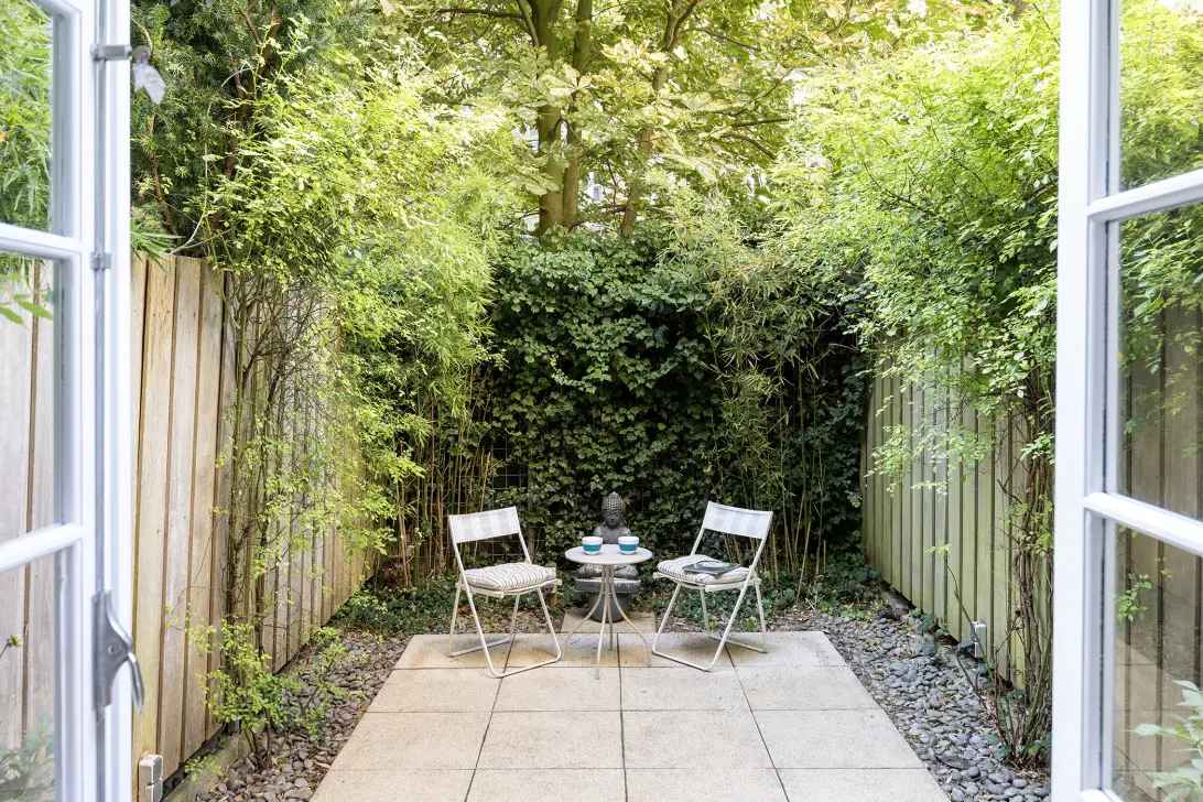 De bovenste verdieping biedt twee extra slaapkamers. De kamer aan de achterzijde heeft een eigen badkamer en suite met inloopdouche, wastafel en toilet, en geeft toegang tot het grote dakterras op het zuiden. Vanaf hier geniet u van een prachtig uitzicht over de groene binnentuinen – een zeldzaam rustige en beschutte plek midden in de stad.