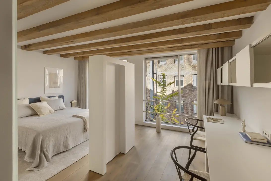 Aan de achterzijde bevindt zich de slaapkamer, met aangrenzend een ruime inloopkast. De luxe afgewerkte badkamer (met vloerverwarming) is voorzien van inloopdouche, bad, wastafel en toilet. In het appartement is zeer veel bergruimte aanwezig, slim weggewerkt in het maatwerk interieur.