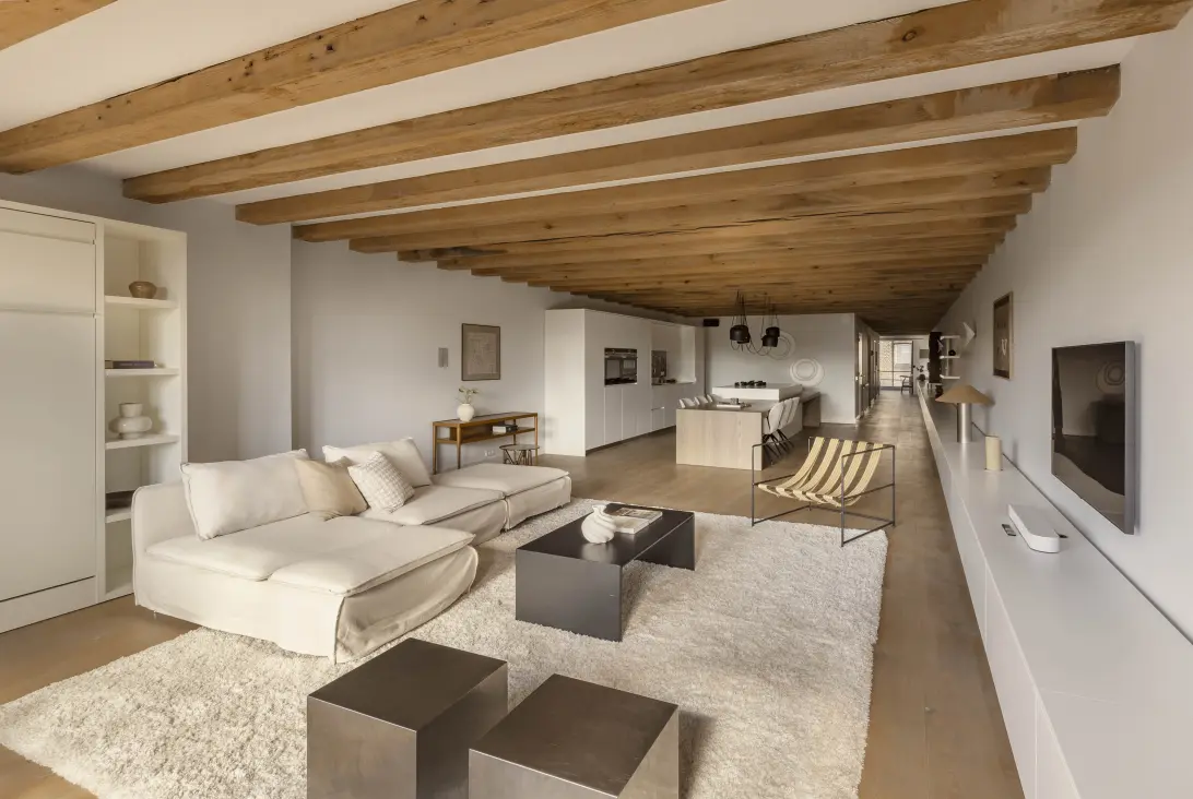 Door de gehele woning ligt een eiken vloer en rustieke houten balken op het plafond die zorgen dat de ruimte warm aanvoelt.