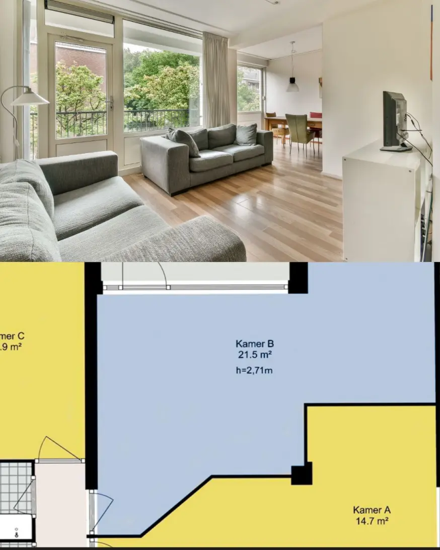 • 3 kamers van respectievelijk 14,7, 21,5 (met 4,5m2 balkon) en 11,9 m2 voor exclusief gebruik, tezamen met de gemeenschappelijke ruimten een woonoppervlak van 84,5 m2 conform Meetinstructie 2580, exclusief berging