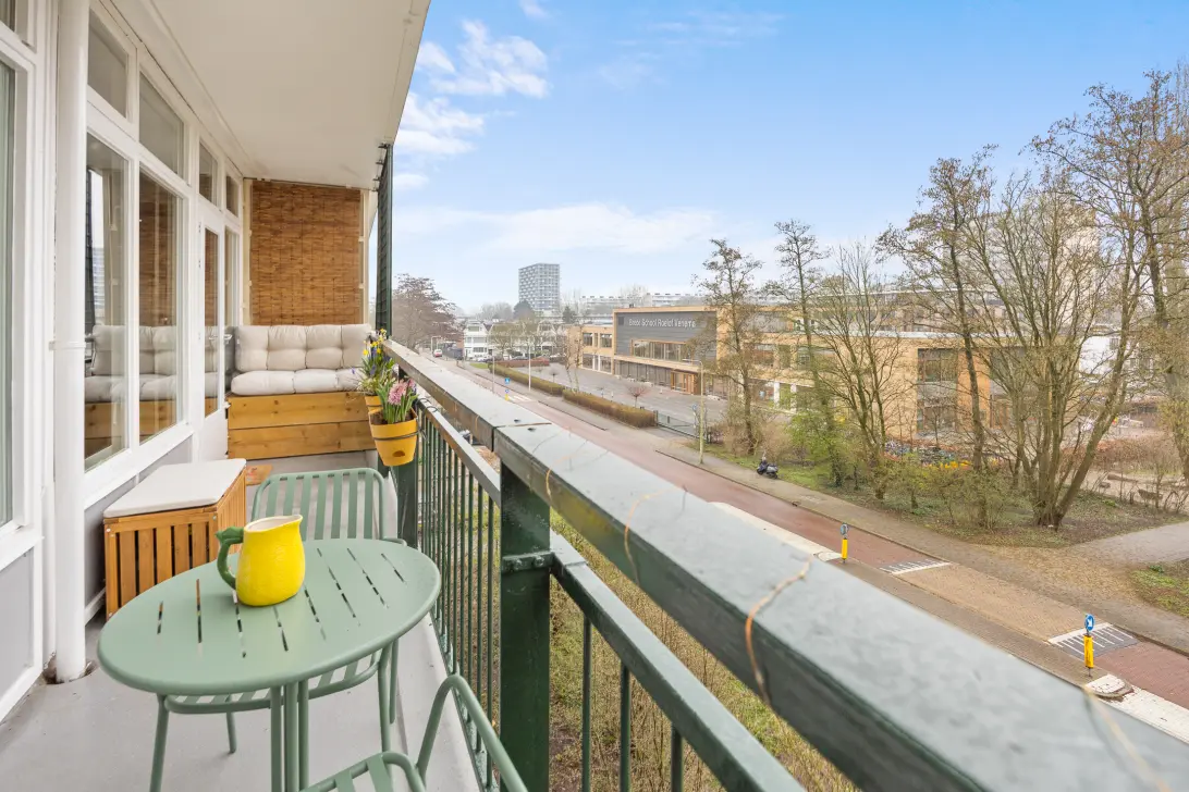 Gelegen op de derde verdieping geniet je van een prettige lichtinval en een open uitzicht over het groen. Het brede balkon op het zuiden zorgt ervoor dat je hier vrijwel de hele dag van de zon kunt genieten , een fijne verlenging van de woonkamer waar binnen en buiten moeiteloos in elkaar overlopen en je gedurende het jaar geniet van het steeds veranderende uitzicht en de seizoenen.