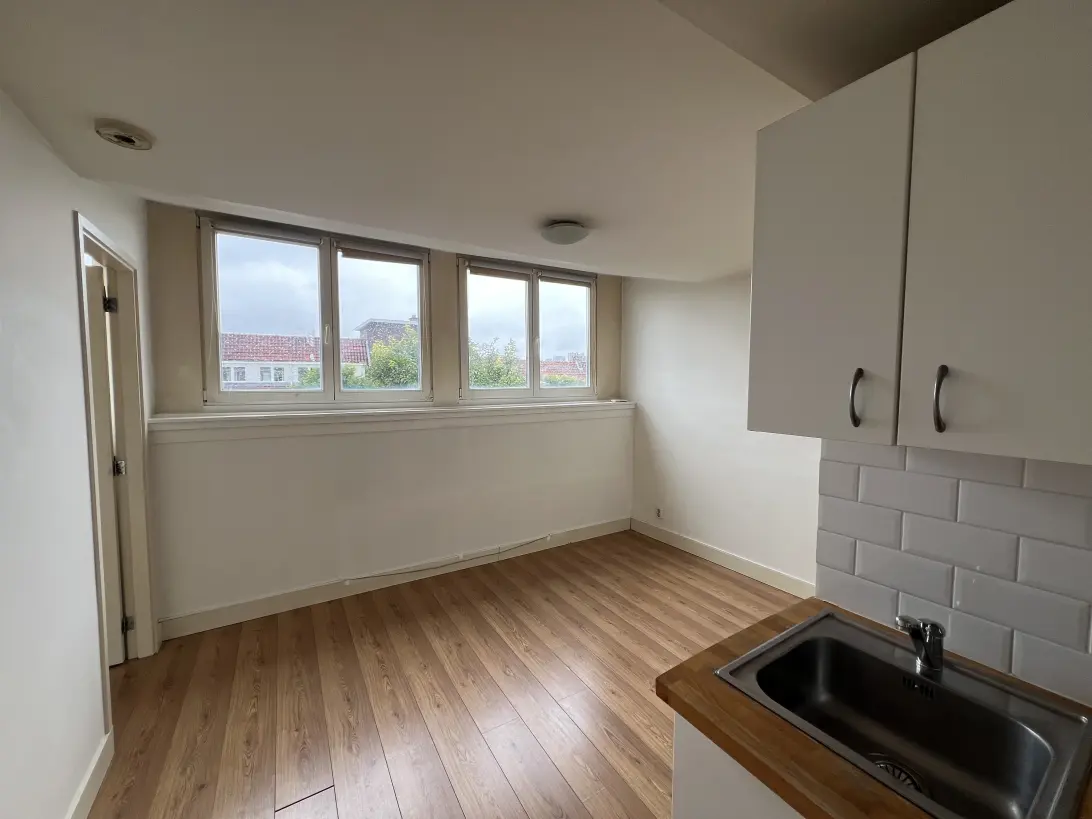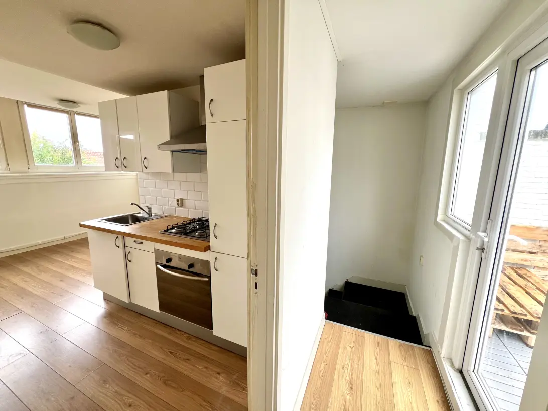 Entree op de derde verdieping. Woongedeelte met open keuken, aparte slaapkamer, badkamer met douche, toilet en wastafel. Doordat de woning zich op de bovenste verdieping bevindt, beschikt deze ook over een handige zolderruimte – ideaal als bergruimte. Let op: momenteel is deze nog niet toegankelijk; een luik dient nog geplaatst te worden.