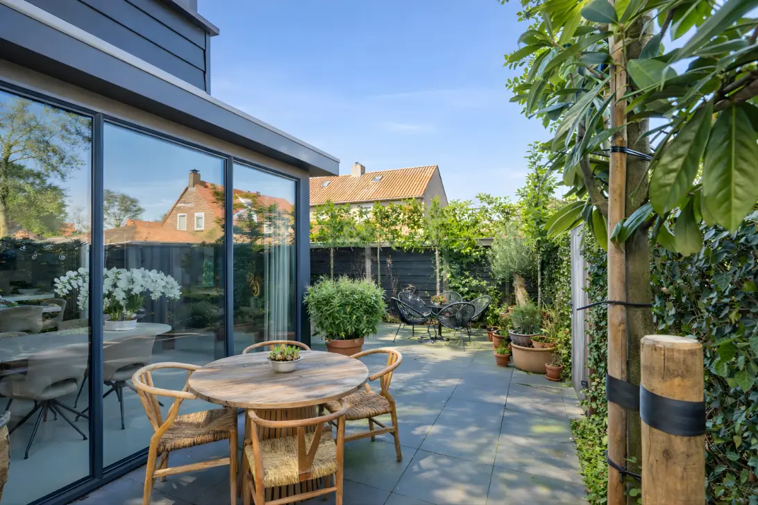 - de dubbele keukendeur naar de achtertuin is voorzien van een dubbele plissé hordeur;