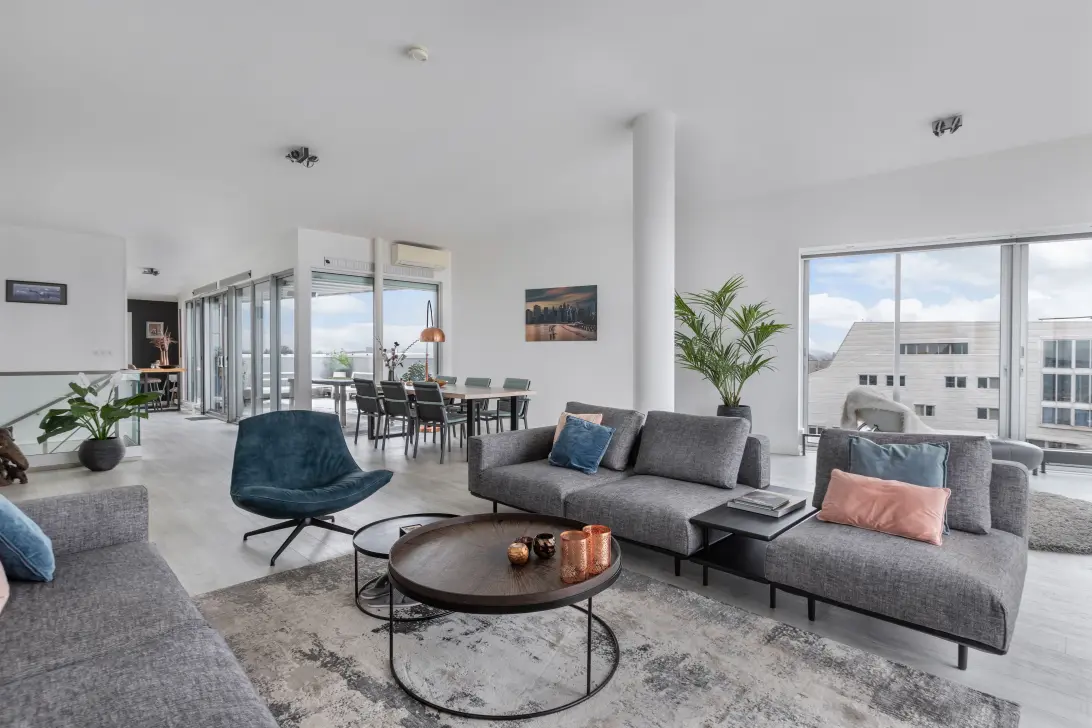 Dit luxueuze appartement van 160m² met een fantastisch dakterras op het westen is verdeeld over 2 woonlagen op de bovenste verdiepingen van appartementencomplex Memphis. Het royale en luxe appartement beschikt over twee eigen parkeerplaatsen en een ruime berging in de onderbouw.