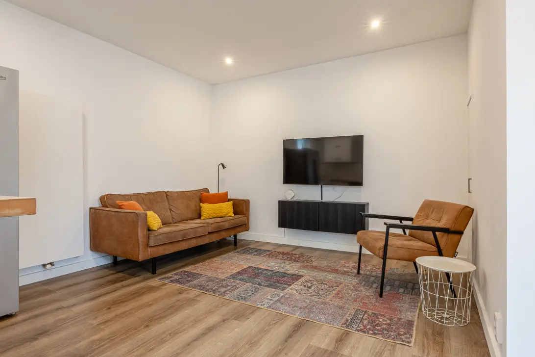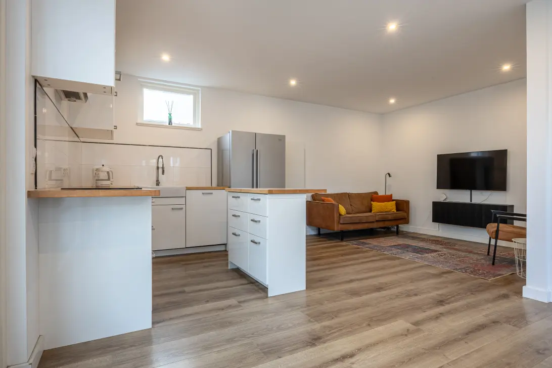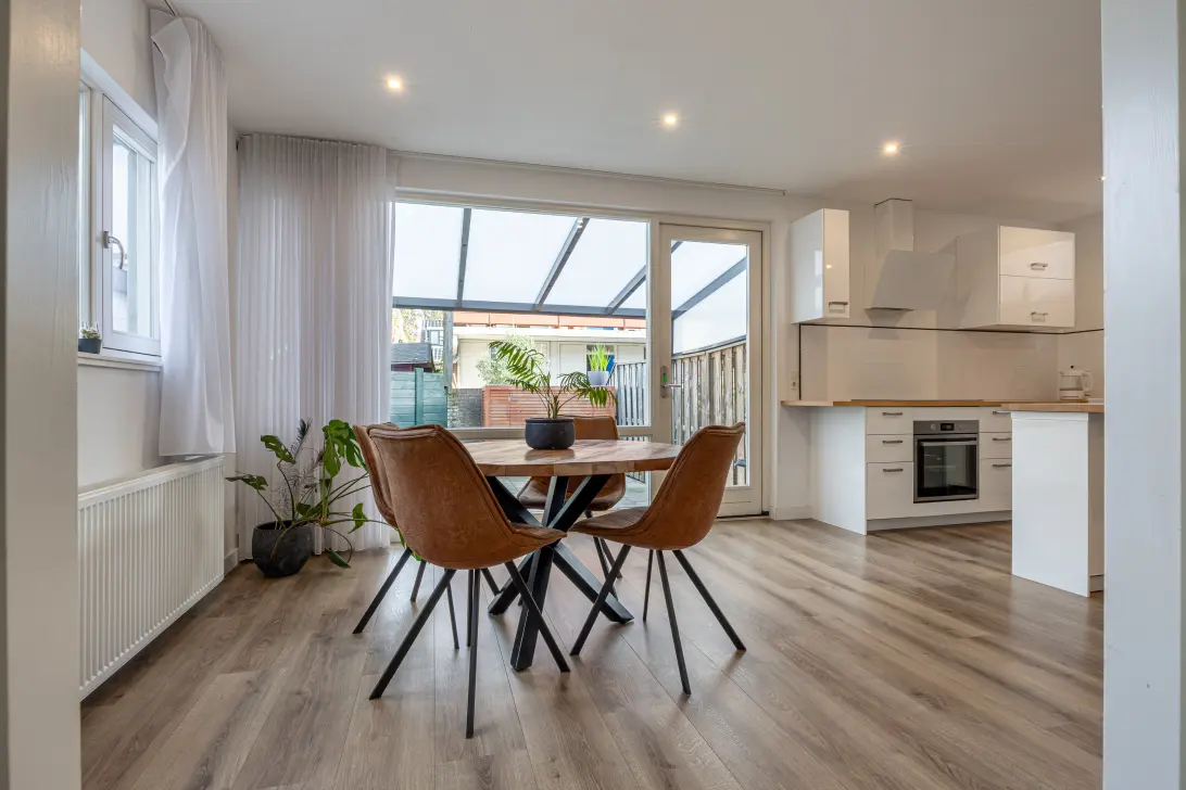 Via de zij-entree in de steeg stap je binnen in een sfeervolle living waar de warme uitstraling van het woonhuis direct voelbaar is. De grote ramen zorgen voor een fijne lichtinval en geven de ruimte een open, luchtige sfeer. De indeling is praktisch en gezellig, met voldoende plek voor een comfortabele zithoek en een eettafel waar je met gemak samen kunt komen.