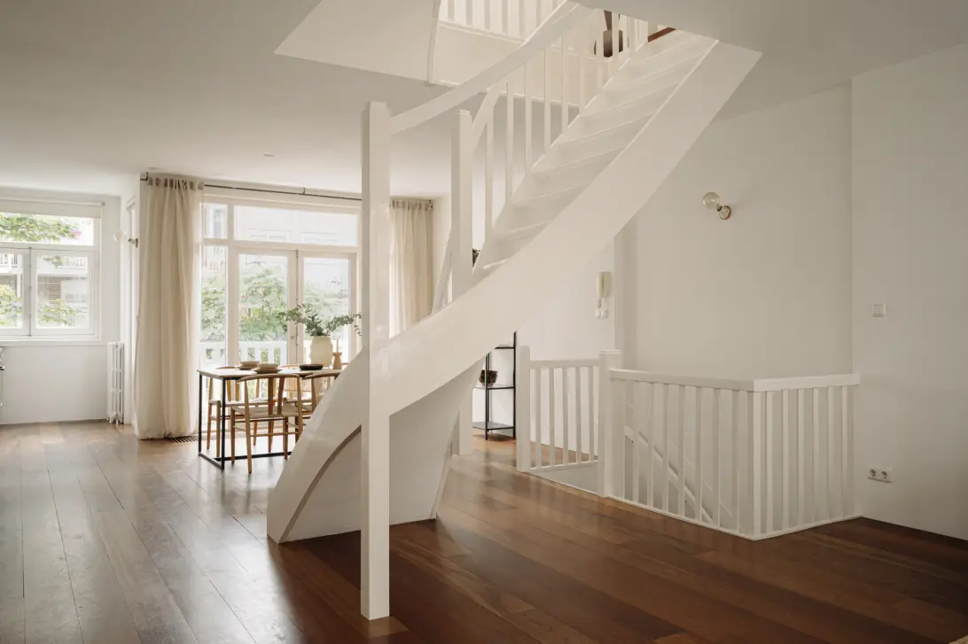 De trap leidt naar de eerste verdieping. De woonkamer ontvouwt zich als een brede ruimte met drie hoge ramen aan de voorzijde, gericht op het zuiden. Het licht valt diep naar binnen en op zomerse dagen kunnen de hoge ramen worden geopend, zodat de straat bijna een verlengstuk van de woning wordt. In de vloer zijn convectorputten verwerkt, die onzichtbaar zorgen voor verwarming zonder het zicht of de indeling te verstoren.