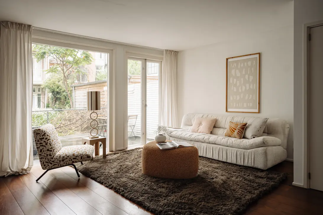 Naast de besloten achtertuin en de balkons op de verdiepingen is er nog een onverwacht extra: de grote ramen aan de voorzijde van het huis. Deze kunnen volledig open en veranderen de vensterbank in een plek waar je al vroeg in het voorjaar in de zon kunt zitten, met uitzicht op de levendigheid van de Jordaan.