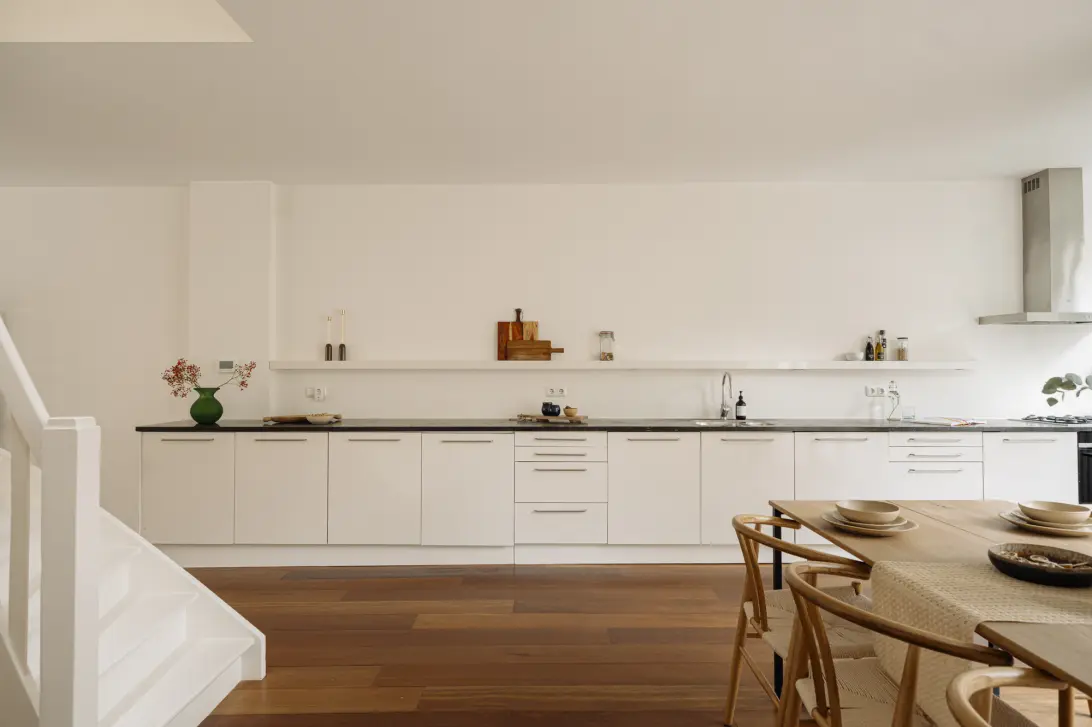 Het woongedeelte loopt door naar de eetkamer aan de achterzijde, waar openslaande deuren toegang geven tot een balkon. Dit balkon vangt minder zon, maar biedt een aangename plek voor frisse lucht en ventilatie. De keuken is in de lengte van de ruimte geplaatst, met een royaal werkblad dat naadloos aansluit op de leefruimte. Het maakt koken tot een sociale bezigheid, waarbij contact met de zitkamer behouden blijft.