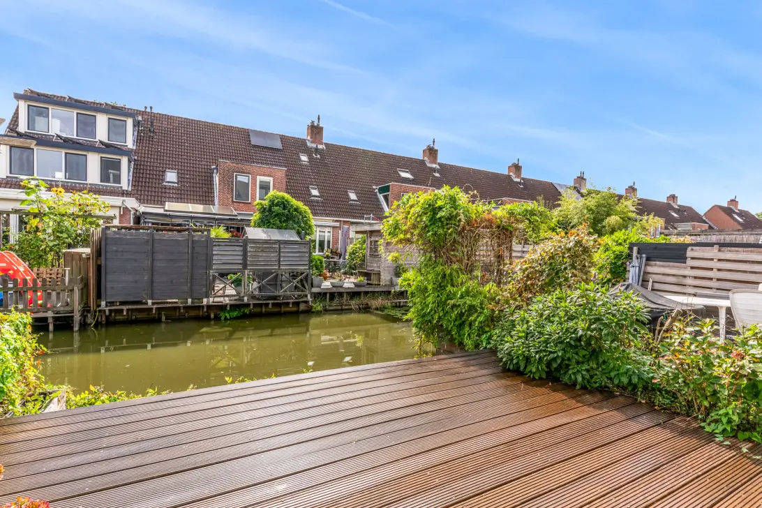 De achtertuin ligt op het oosten, direct aan het water, en is voorzien van een grote houten vlonder en een elektrisch zonnescherm.