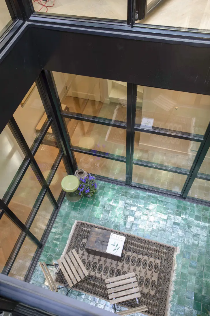 The adjoining living area at the rear, with its glass skylight and patio, forms the true centrepiece of the home. The patio, finished with handcrafted Moroccan Zellige tiles, extends over two levels and creates an intimate, almost Mediterranean atmosphere.