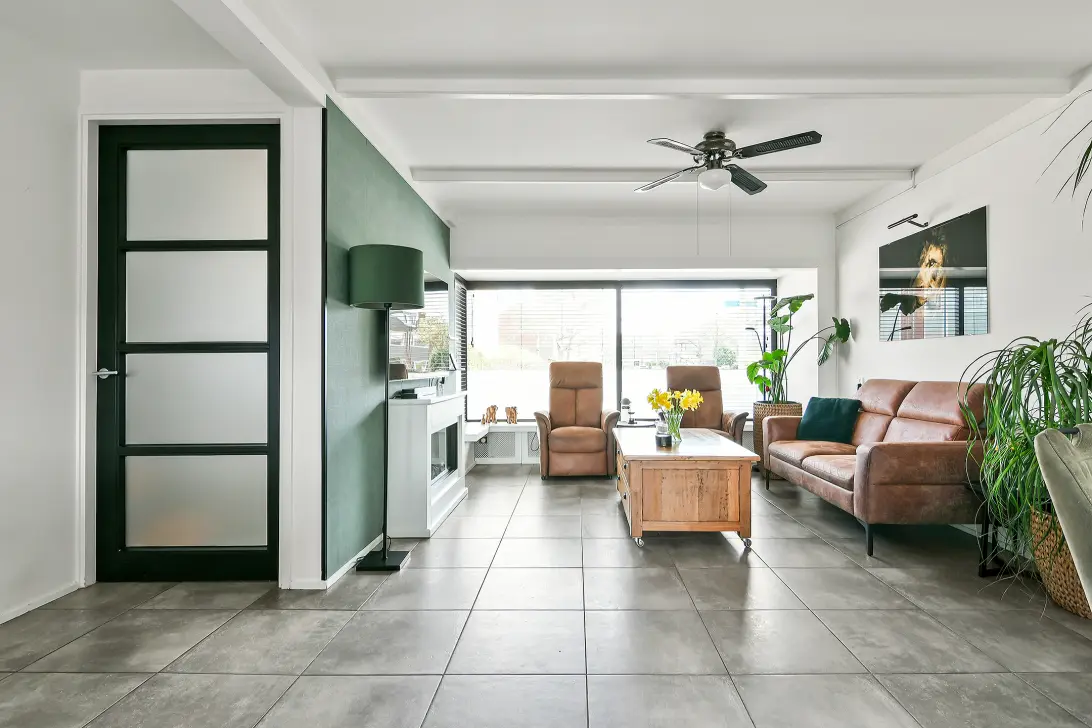 De woonkamer is opvallend ruim en licht dankzij de uitbouw aan de voorzijde en de open verbinding met de keuken. De ruimte is strak afgewerkt met nette wanden en plafonds en voorzien van een plavuizen met comfortabele vloerverwarming. Tevens is de woonkamer uitgerust met een airco, wat zorgt voor extra comfort tijdens warme dagen. Deze kan ook verwarmen tijdens koude dagen.