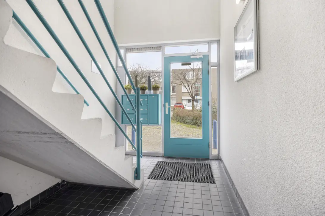 Entree met bellentableau, brievenbussen en trapopgang.