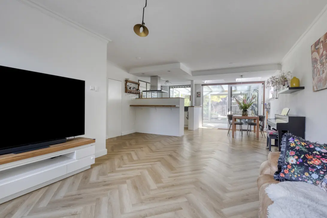 Zowel vanuit de keuken als vanuit de eetkamer heb je toegang tot buiten: een schuifpui naar de serre en een tweede schuifpui naar de achtertuin. De serre vormt een sfeervolle verlenging van de woonkamer en biedt directe toegang tot de tuin.