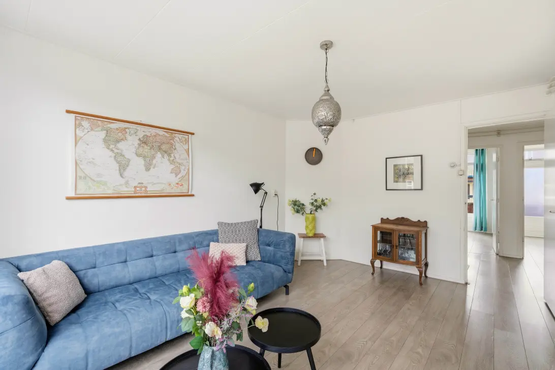 Via het gezamenlijke trappenhuis bereik je de woning op de tweede verdieping. Je komt binnen in de hal die centraal in het appartement ligt en van waaruit je bijna alle ruimtes bereikt.