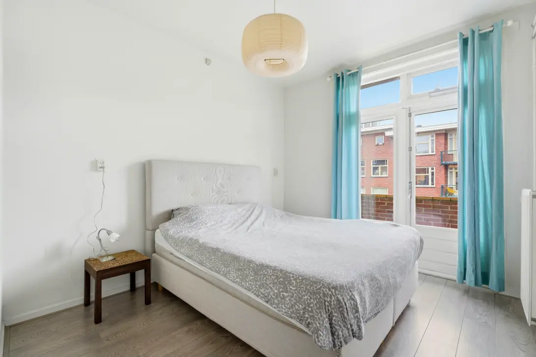 Aan de achterzijde ligt de grootste slaapkamer. Deze kamer is ruim opgezet en heeft openslaande deuren naar het balkon van circa 4 m² – een fijne plek voor een kop koffie in de ochtendzon. Naast deze kamer ligt de keuken. Vanuit de keuken loop je via een deur ook het balkon op. De keuken is compact en praktisch ingericht, met voldoende werk- en kastruimte.