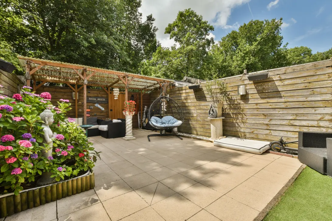 De tuin ligt op het zuidwesten en beschikt grotendeels over bestrating, borders met vaste beplanting en een overkapping achterin de tuin en een achterom. Doordat er achter geen bebouwing aanwezig is biedt de tuin veel privacy.