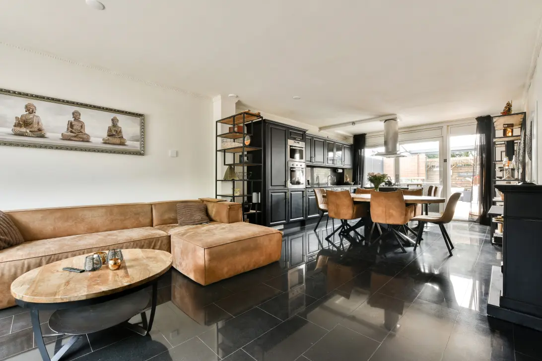 De woonkamer en keuken geven via een grote schuifpui en een openslaande deur toegang tot de afsluitbare serre en achtertuin.