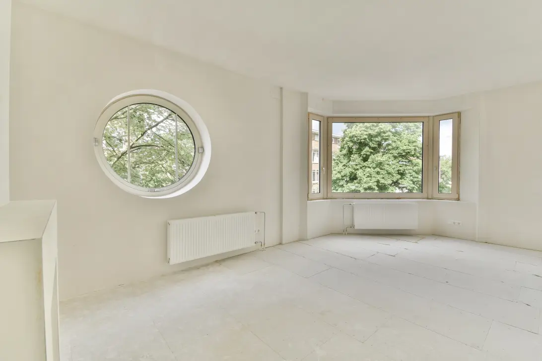 Unique features of this apartment include the beautiful rounded windows and the large bay window in the living room, providing an abundance of natural light. The property was largely renovated in 2025 and has been given a smart new layout. Two bedrooms have been created, and an open kitchen area introduced, giving the apartment a modern and spacious feel. The home is delivered without a kitchen and bathroom, allowing the new owner to finish and style these entirely to their own taste.