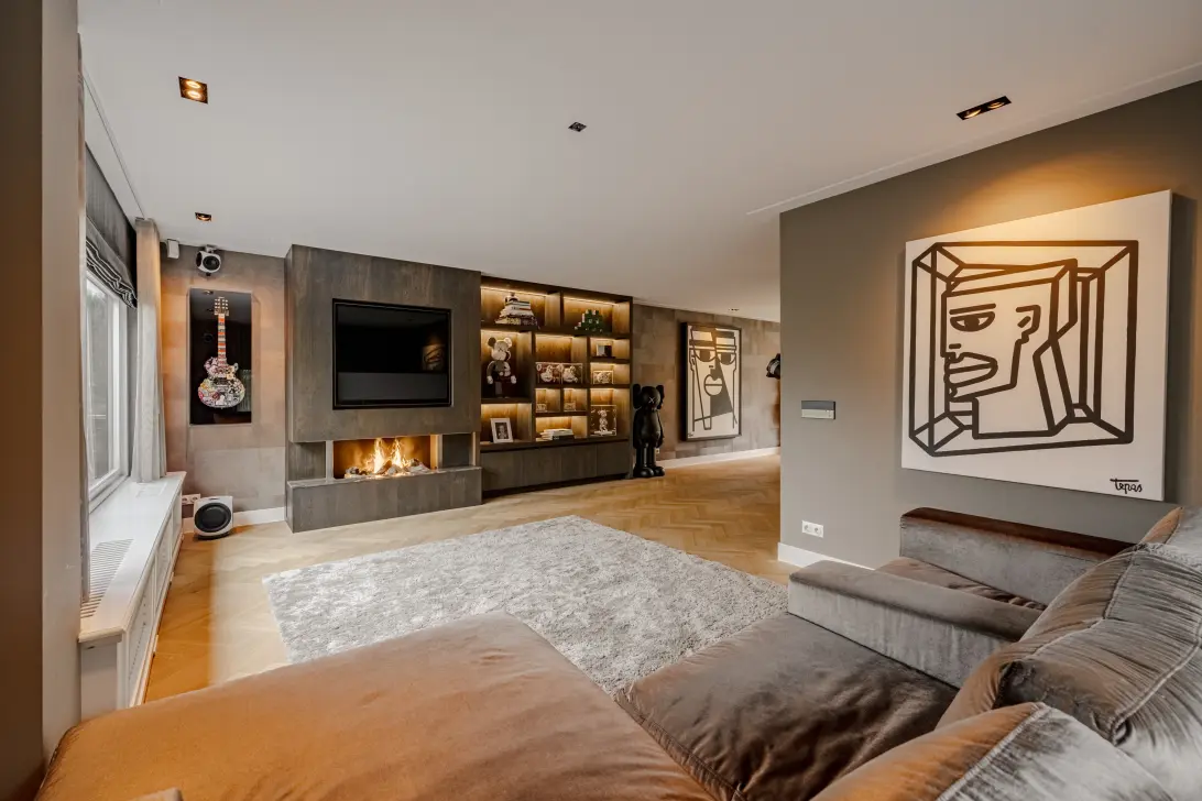 De living is ruim en licht, voorzien van een prachtige visgraat parketvloer. De wanden zijn fraai behangen met hoogwaardige materialen, wat de ruimtes een warme en verfijnde uitstraling geeft. De sfeervolle Cinewall met gashaard, uitgevoerd in grijs eiken met marmer, vormt het stijlvolle hart van de woonkamer.
