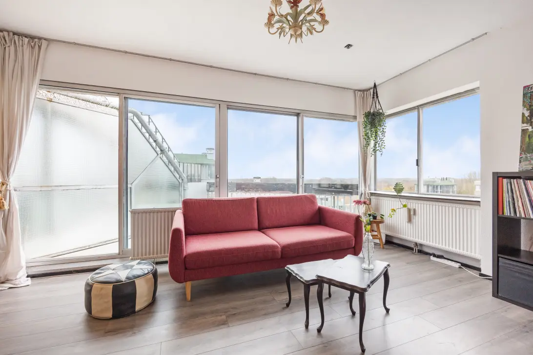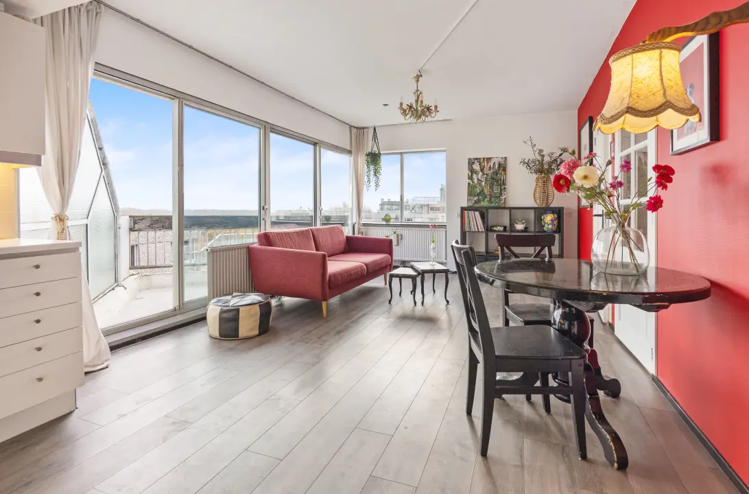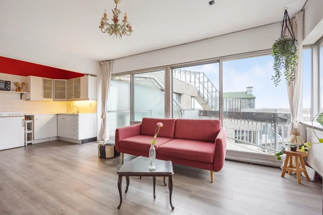 This apartment forms part of a well-maintained, architect-designed complex surrounded by greenery. A varied covered walkway leads to the residential tower with a secured entrance and lift. The home is characterised by large windows that provide plenty of natural light and offer stunning, open views of the surroundings. Additionally, you have no upstairs neighbours, and there is a southeast-facing balcony where you can enjoy a drink or a bite in the sun! But that’s not all: the apartment has a practical layout with two rooms, an open kitchen, and, finally, a favourable switch has been made to the perpetual ground lease.