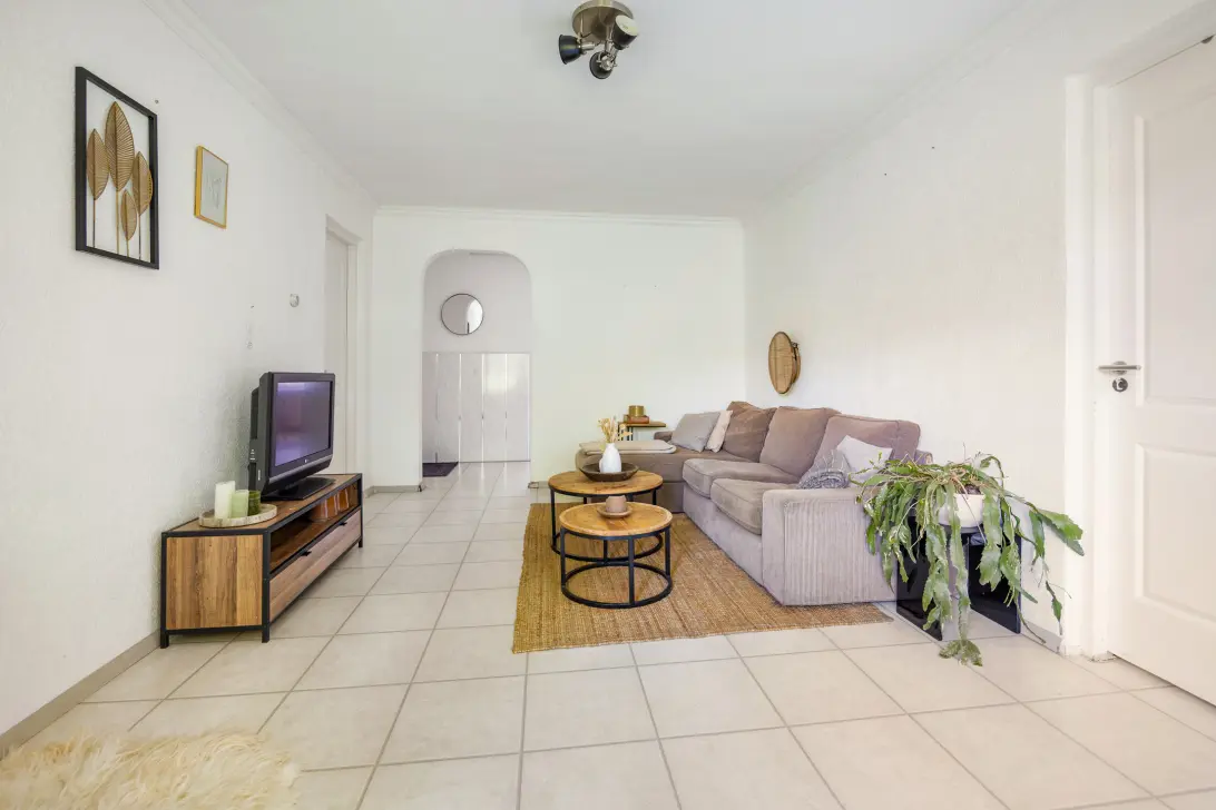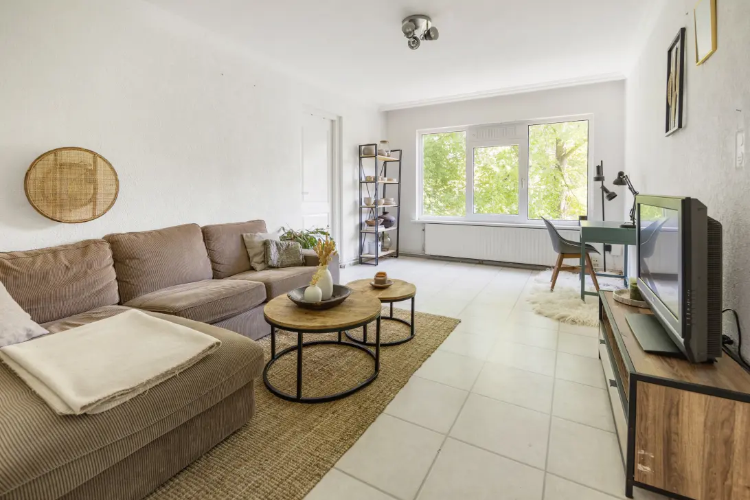 Through the entrance you enter a spacious hall with enough space for a wardrobe and access to the living room, kitchen, bathroom and a separate toilet. The living room is located at the rear of the house and is wonderfully light due to its large window frames. From here you reach two of the three bedrooms, both spacious enough for a double bed and closet or desk. One of these rooms opens onto a sunny southeast-facing balcony overlooking a green courtyard.