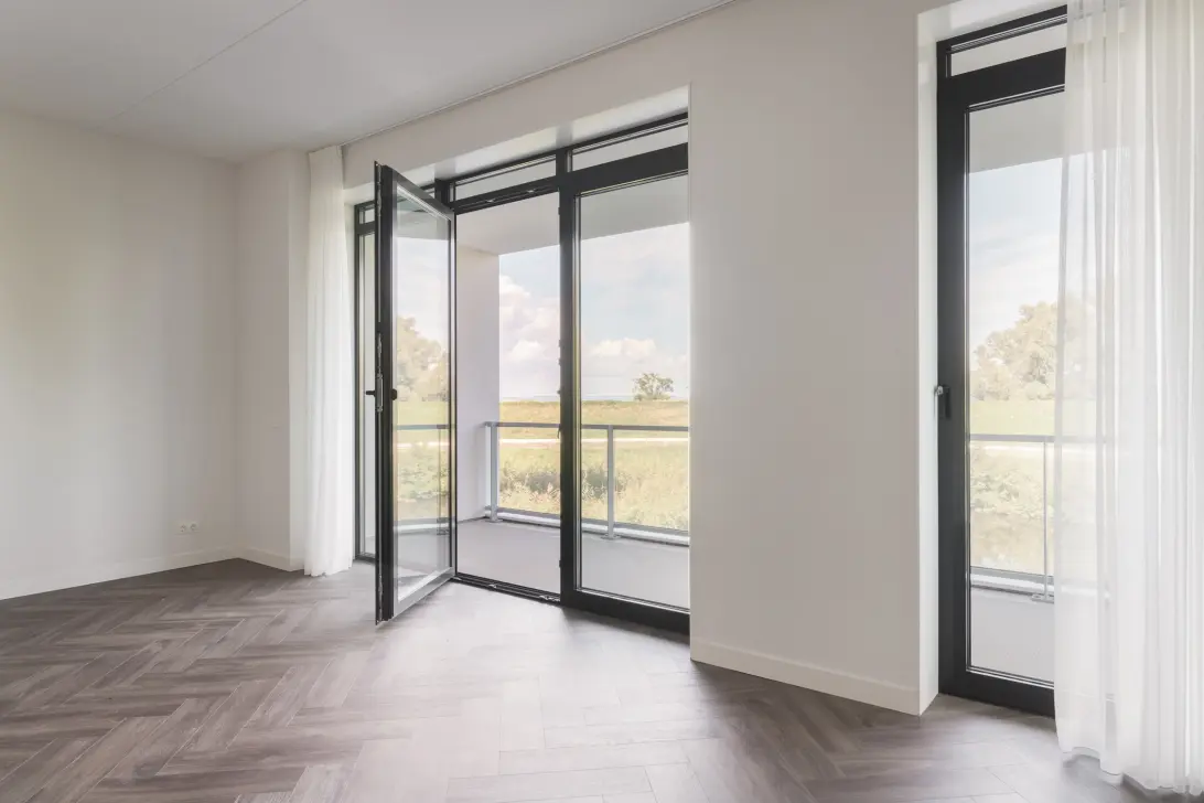 die toegang geven tot het balkon. Vanuit hier kijk je over groen en het IJmeer, een uitzicht