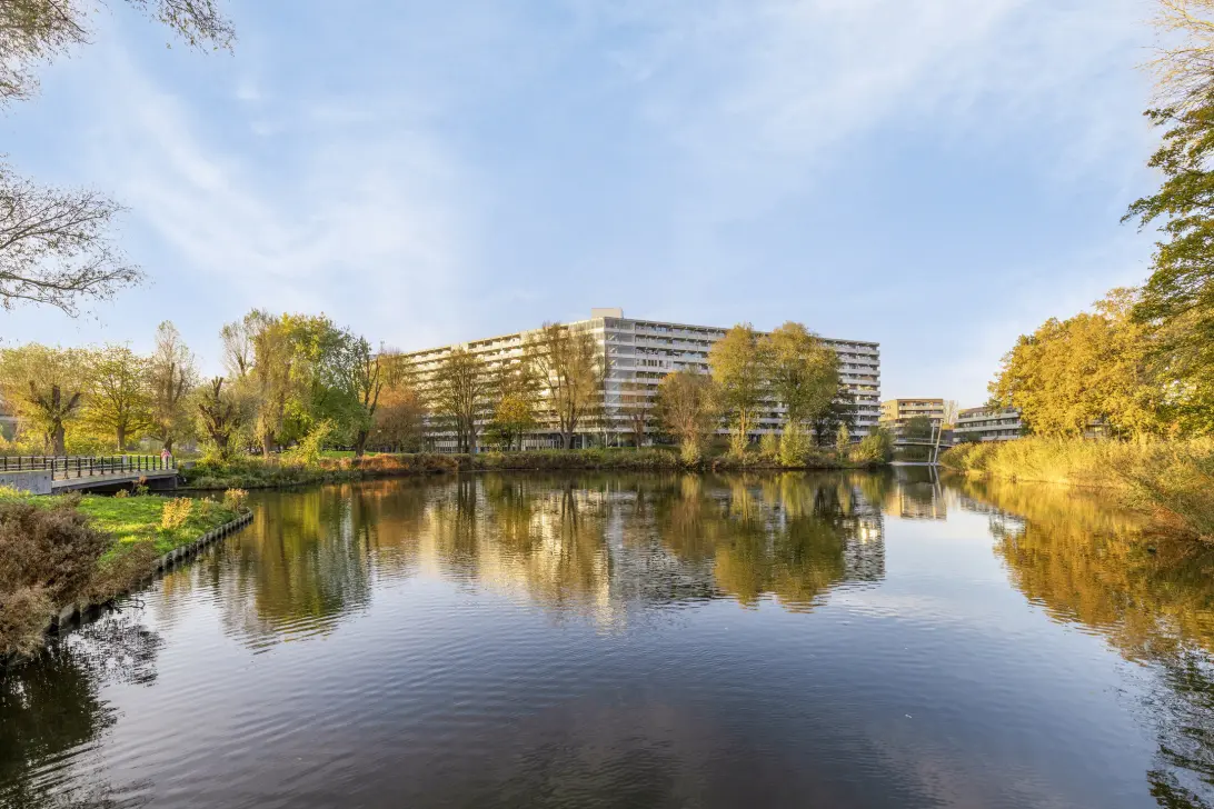 Vanuit de woonkamer en twee slaapkamers heb je toegang tot het meer dan 9.60 meter brede balkon, gesitueerd op het zuidoosten. Het uitzicht naar het park met hoge bomen en het water is erg fraai. Zie jij jezelf hier al zitten?