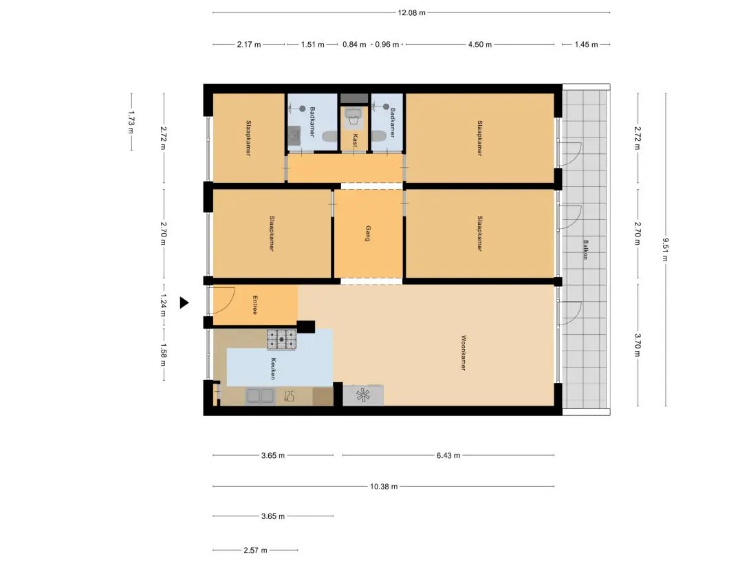 De woonkamer met halfopen keuken is een sfeervolle, lichte leefruimte met een deur naar het balkon en een mooie verdeling tussen het zit- en eetgedeelte. Meerdere appartementen in het gebouw hebben het eetgedeelte verplaatst naar een van de slaapkamers waardoor de woonkamer nog meer ruimte biedt. In de tussenhal naar de slaapkamers is ruimte voor een mooie werkplek.