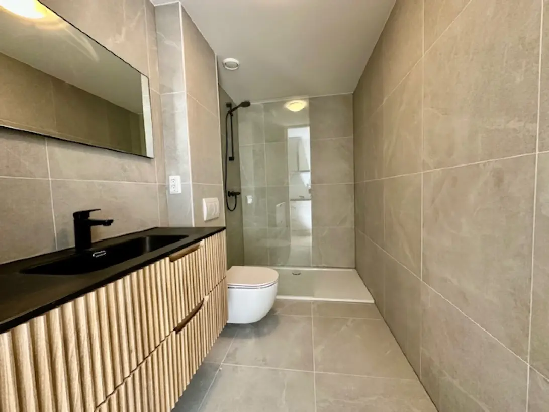 De badkamer is modern en strak ingericht, voorzien van een inloopdouche, wastafelmeubel en hoogwaardige sanitair. De woning wordt verwarmd en gekoeld via een energiezuinig airco-systeem, zodat je in elk seizoen kunt genieten van een aangenaam binnenklimaat.