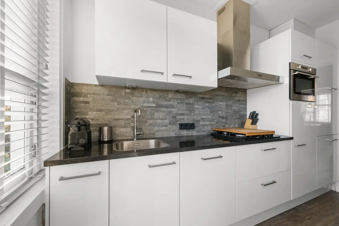 Upon entering, you come into the hallway/entrance, which gives access to the spacious living room. The living room and former side room have been combined into one large, bright living space. Large windows provide plenty of natural light and an open, fresh atmosphere. The living room offers access to the balcony at the front of the apartment (west-facing), where you can enjoy the sun in the afternoon and evening. The fireplace adds to the cozy atmosphere, perfect for relaxing evenings. From the living room, you look out over Bos en Lommerplein – a lovely and lively view. The hallway also leads to the stylish and modern bathroom, equipped with a walk-in shower with glass walls, a vanity unit with a heated mirror, a hanging toilet, and mechanical ventilation. At the rear of the apartment is the bedroom, which opens to the second balcony (east-facing), where you can enjoy the morning sun. If desired, there is space to create a second bedroom. The kitchen also has access to the balcony and is equipped with modern appliances (2016): a Siemens dishwasher (about 1.5 years old), a 4-burner gas hob, an extractor fan, and a combi-oven. The washer/dryer combo (2024) is neatly hidden in a spacious built-in closet.