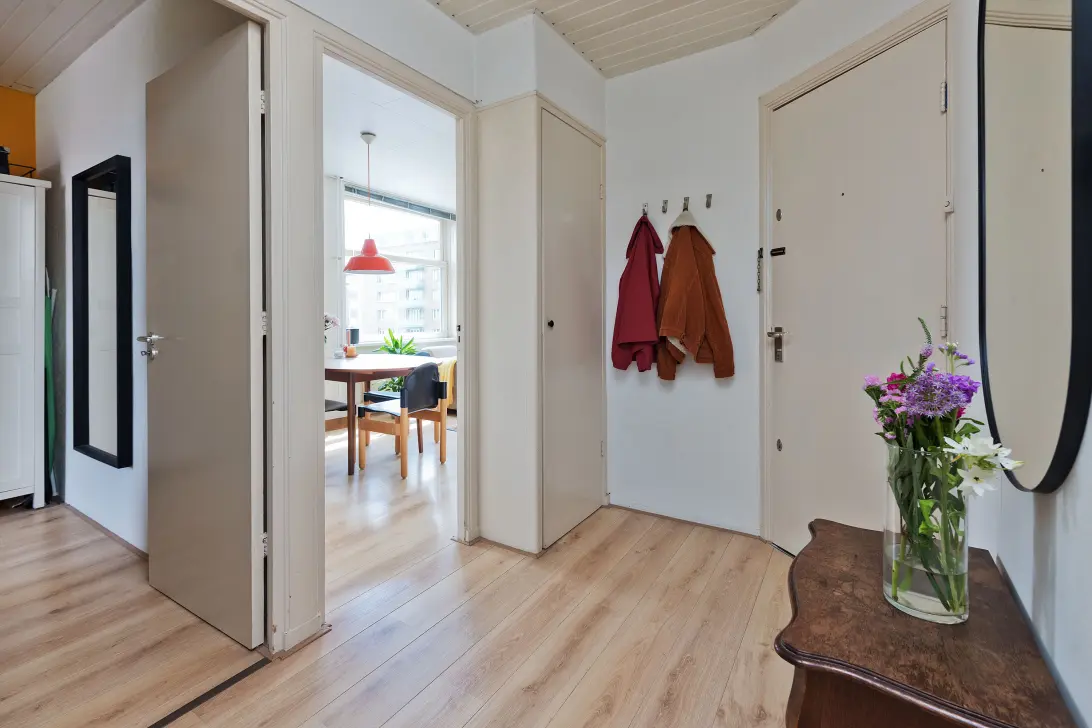 Entree, ruime hal met meterkast, lichte woon-/eetkamer met originele marmeren schouw en toegang tot het balkon aan de voorzijde, zitkamer aan de voorzijde, dichte keuken met toegang tot het balkon aan de achterzijde, badkamer met toilet, slaapkamer met openslaande deuren naar het balkon aan de achterzijde en tweede slaapkamer aan de achterzijde.