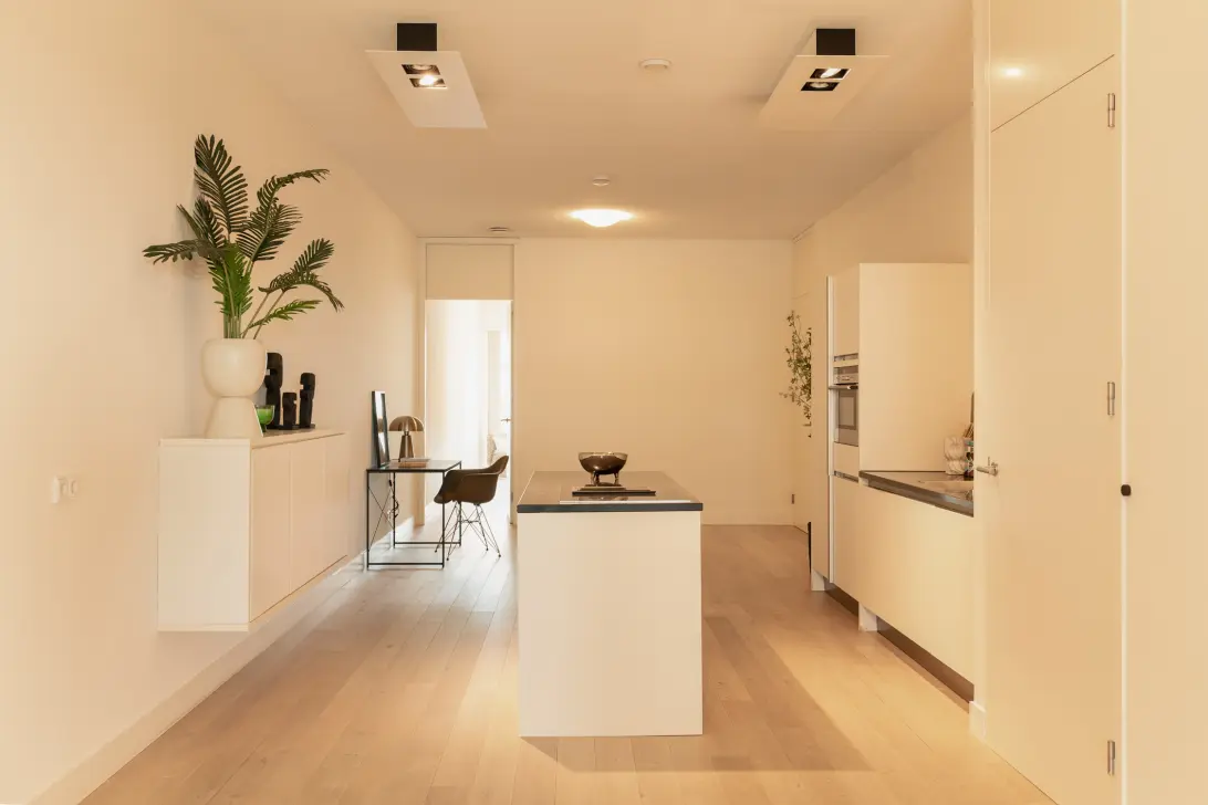 Met de lift bereikt u het appartement op de veertiende verdieping. De ruime hal geeft toegang tot alle vertrekken. De royale woonkamer is bijzonder licht dankzij de grote raampartijen en biedt volop ruimte voor een comfortabele zithoek en een grote eettafel. De moderne, open keuken is voorzien van luxe inbouwapparatuur, natuurstenen werkblad en veel opbergruimte.