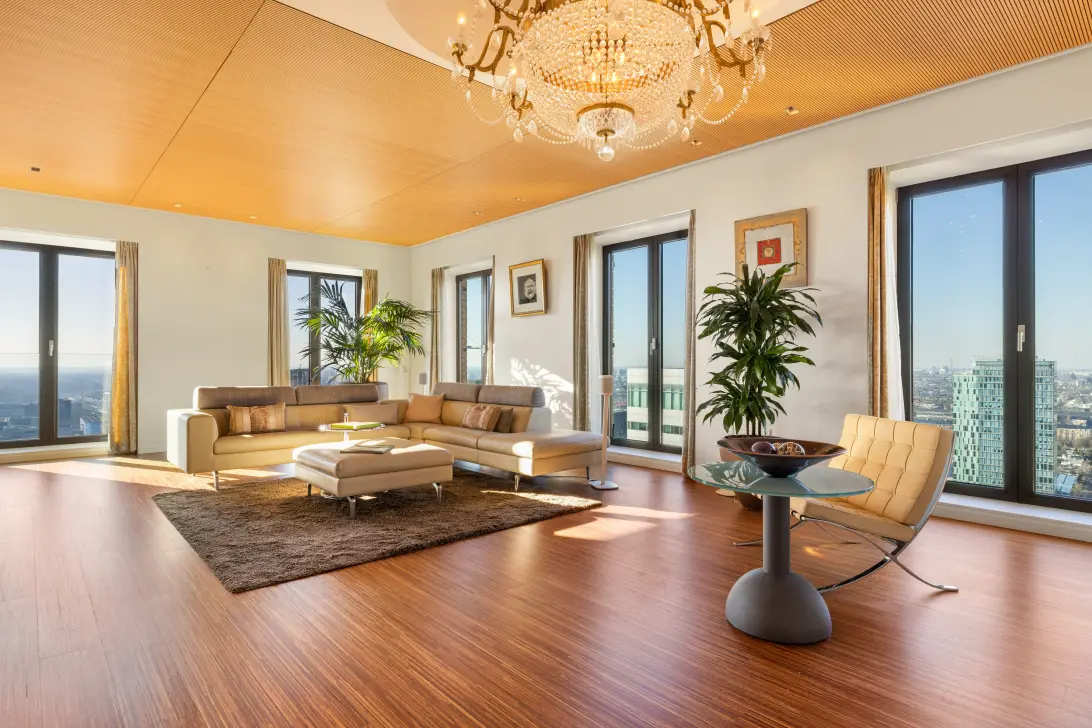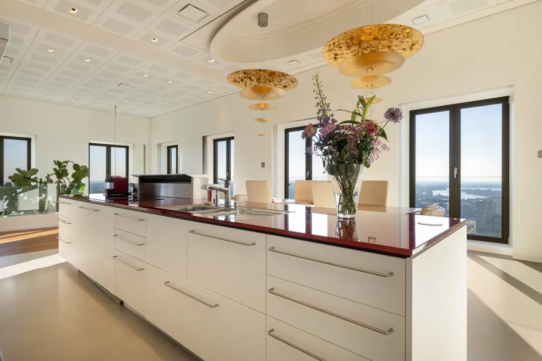 Een schuifdeur leidt naar de imposante en lichtovergoten living. Dankzij de unieke hoekligging biedt deze ruimte een spectaculair uitzicht over Amsterdam en de skyline van de Zuidas, met een prachtige natuurlijke lichtinval gedurende de dag. Aangrenzend aan de living bevindt zich een elegante ‘powder room’ met een separaat gastentoilet.