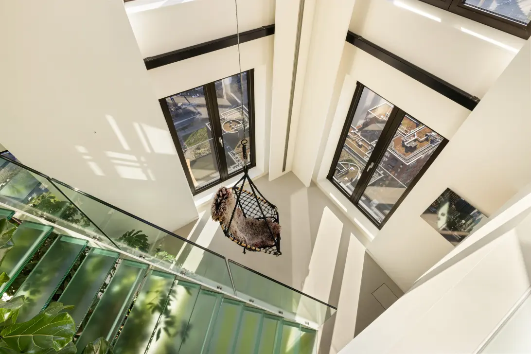 Vanuit de "lounge" leidt een moderne designtrap met glazen treden naar de spectaculaire bovenverdieping.