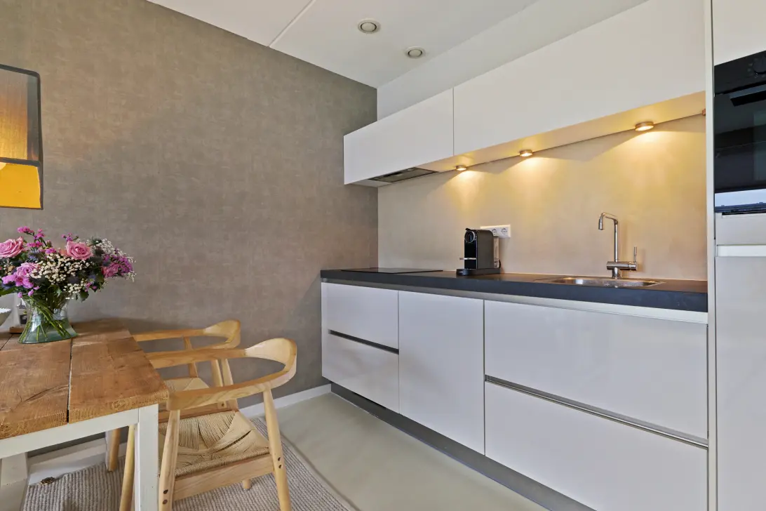 In het verlengde van de woonkamer is de moderne, open keuken gesitueerd die dankzij de open indeling naadloos aansluit bij de leefruimte. Deze opstelling zorgt ervoor dat koken een sociale en gezellige aangelegenheid wordt. De keuken is voorzien van diverse inbouwapparatuur, te weten, een koelkast, vaatwasser, inductiekookplaat en een afzuigkap.