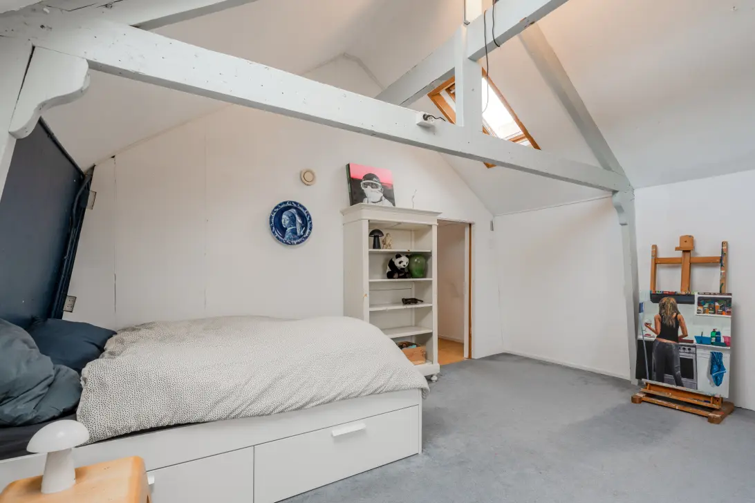 The fourth floor surprises with a beautiful open roof structure and a high ridge, creating an exceptionally spacious and atmospheric feel. Here are two generous bedrooms. In the spacious hall there is an additional shower with wash basin, as well as the central heating unit.