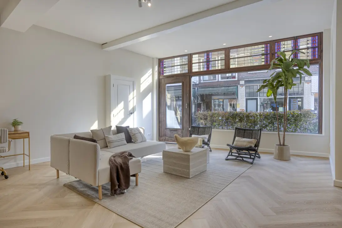 Daarna stap je de ruime, lichte woonkamer binnen. Dankzij de grote ramen en de authentieke details hangt hier direct een warme en karaktervolle sfeer. Zet de deur open en geniet van een zonnig zitplekje direct voor de woning.