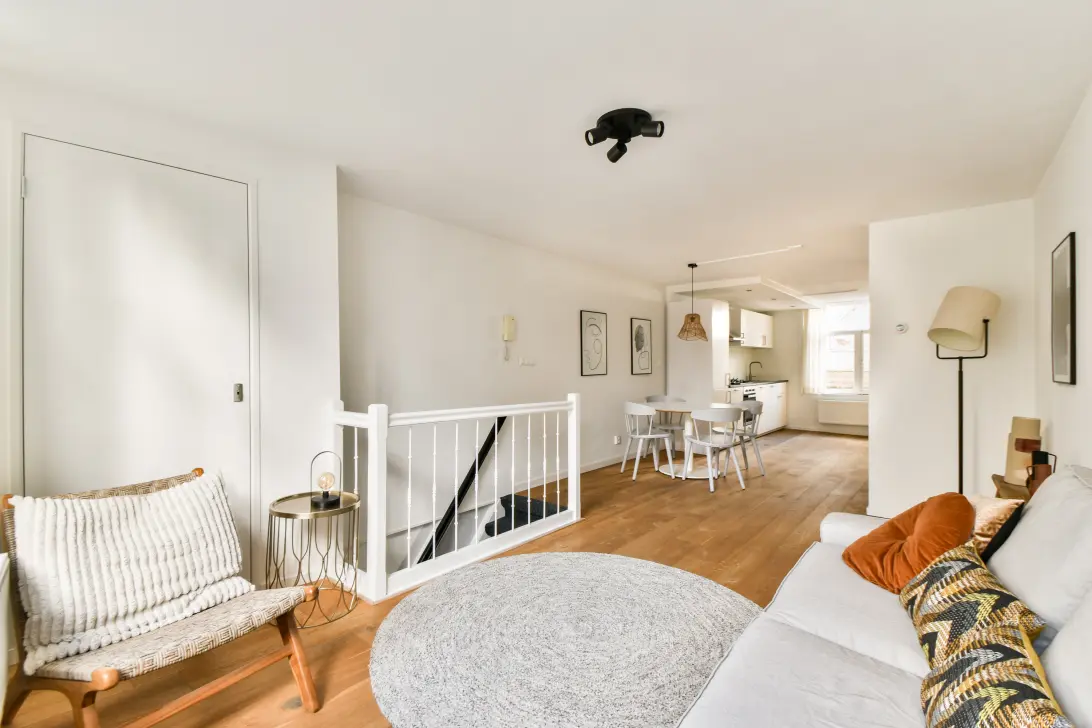 Via de entree op de eerste verdieping toegang naar de tweede verdieping. Hier bevindt zich een appartement met aan de voorzijde en lichte woonkamer. Aan de achterzijde de moderne open keuken voorzien van inbouwapparatuur.
